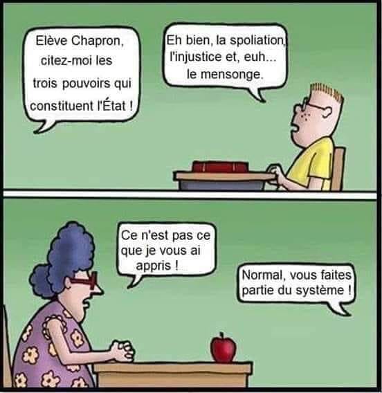 ‒ Elève Chapron, citez-moi les trois pouvoirs qui constituent l'État !